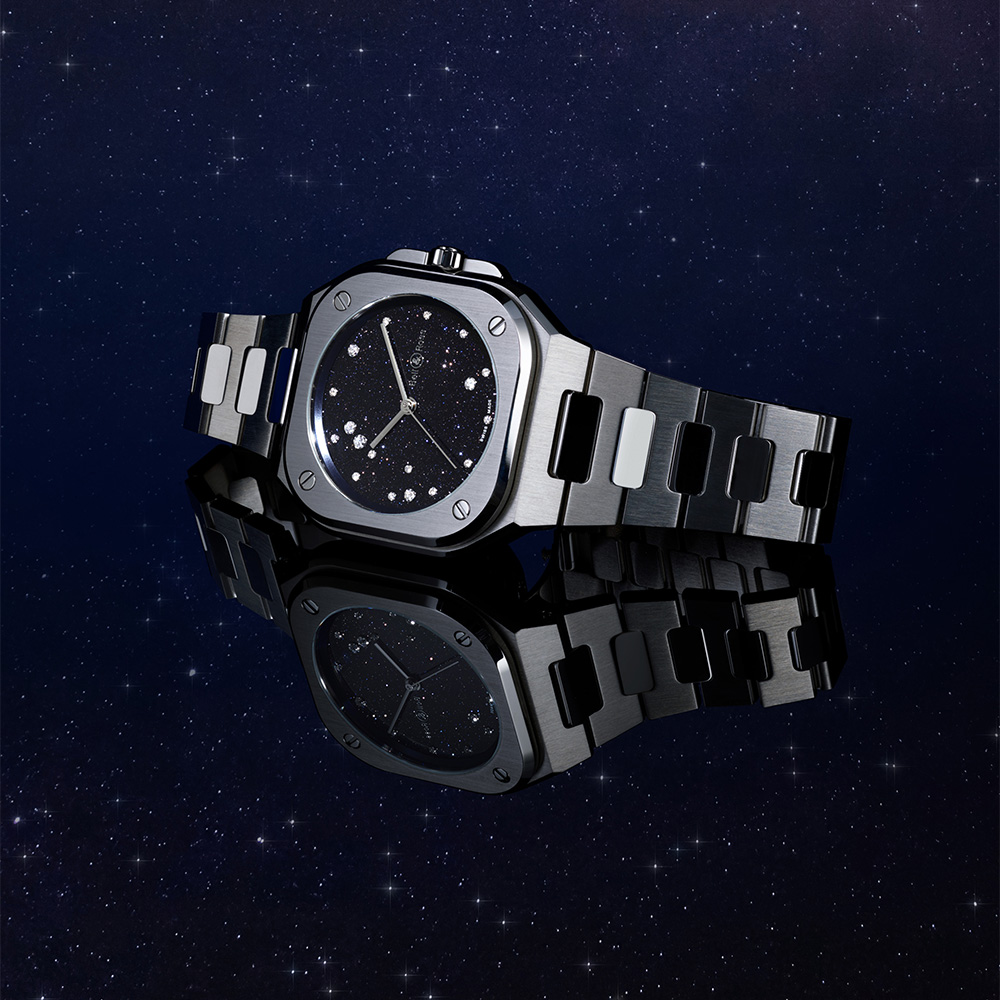 The sky has inspired dreams since the dawn of time. With their gaze turned toward the star-studded firmament,humans have populated it with dreamlike and legendary creatures. Recognizable by the three aligned stars that form the bird’s head, the Eagle constellation (also called Aquila) can be observed in summer and earl y autumn in the Northern Hemisphere. Altair (whose name comes from the Arabic al-nasr al-ṭā ’ir, meaning “the fl ying eagle”) is the brightest star in this constellation and one of the vertices of the Summer Triangle, which heralds the return of warm days. With its wings outstretched, the bird represents Zeus’s eagle in Greek m ythology. It connects the heavens and humankind and perf ectl y symbolizes the DN A of Bell & Ross, inspired by aeronautics. The diamond-set Eagle constellation represents Bell & Ross’s signature: an elegant ref erence to the conquest of the skies, embod ying power, freedom, and the ability to rise above.
