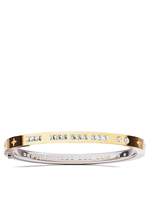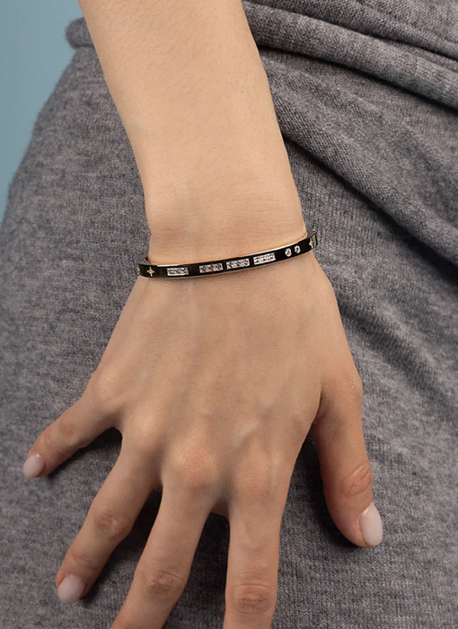This bangle is handcrafted from sterling silver. It is microset with white cubic zirconia to form the words TOI MOI in Morse Code secret language. The meaning is also engraved inside.