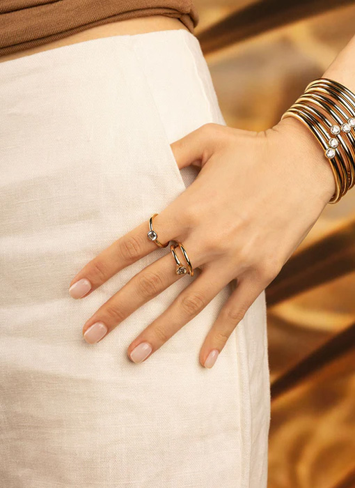 This ring embodies the golden hues of this collection with pavé detail. A timeless design that is easy to wear and mix and match for any occasion. The stone setting allows light to shine through, creating a radiant effect.