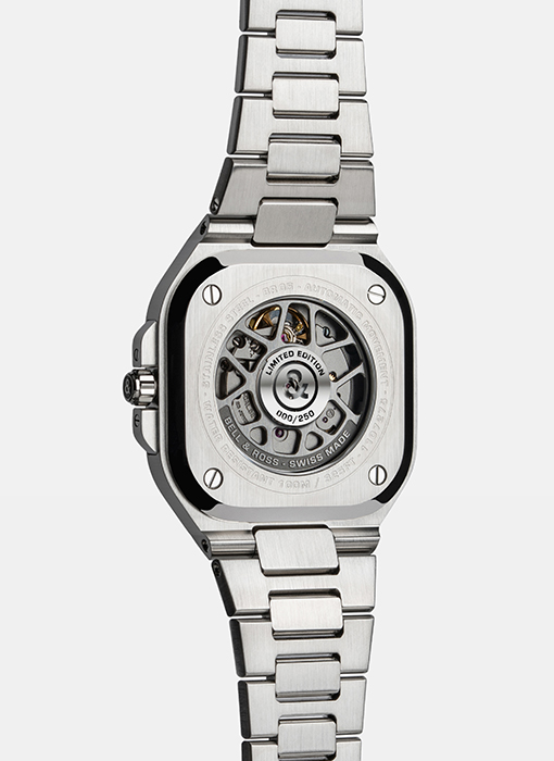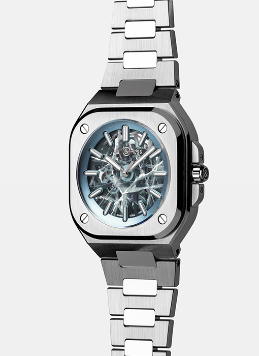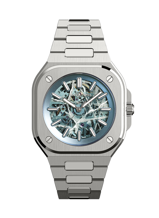 The BR-05 Skeleton collection rises to the challenge of transparency, reflecting true watchmaking expertise. For this new version, the dial of the BR-05 Skeleton Arctic Blue appears to be carved from a block of ice