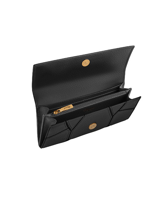12 card slots, 2 compartments for banknotes and 1 zipped compartment for coins
