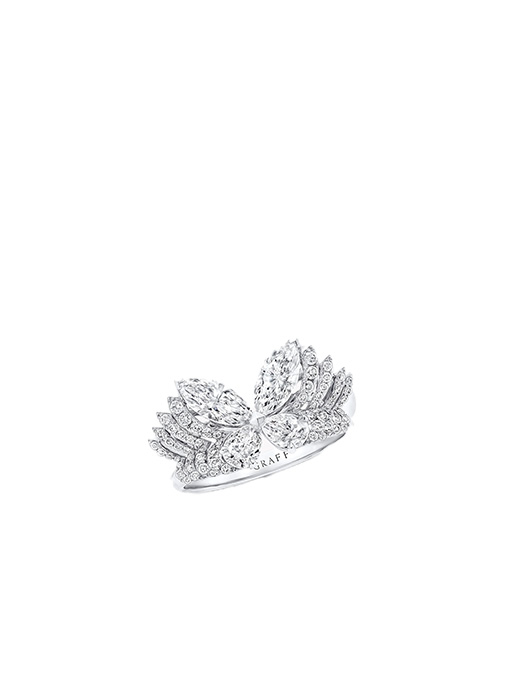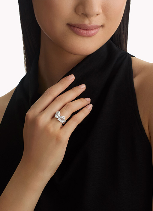 An exquisite diamond butterfly crafted from pear shape and marquise stones is delicately embraced by a hypnotic, graduated arrangement of round diamonds that sweep and curve elegantly around the finger.