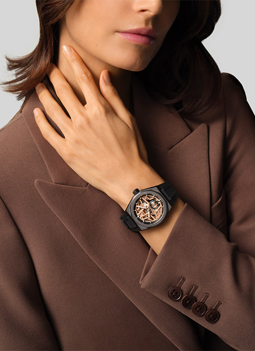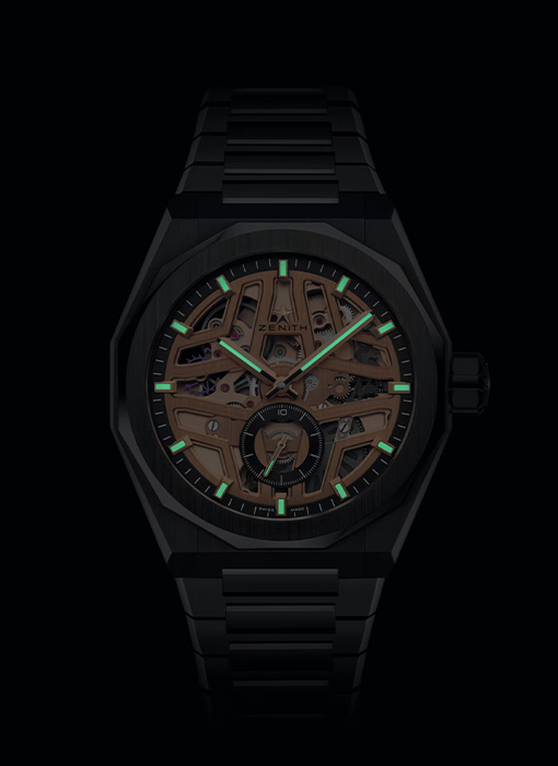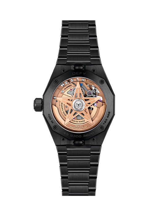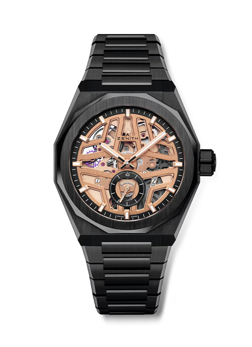 The DEFY Skyline Skeleton in a 41mm black ceramic octagonal case with a faceted bezel, featuring a gold-toned open dial revisiting the emblematic ZENITH four-pointed star.